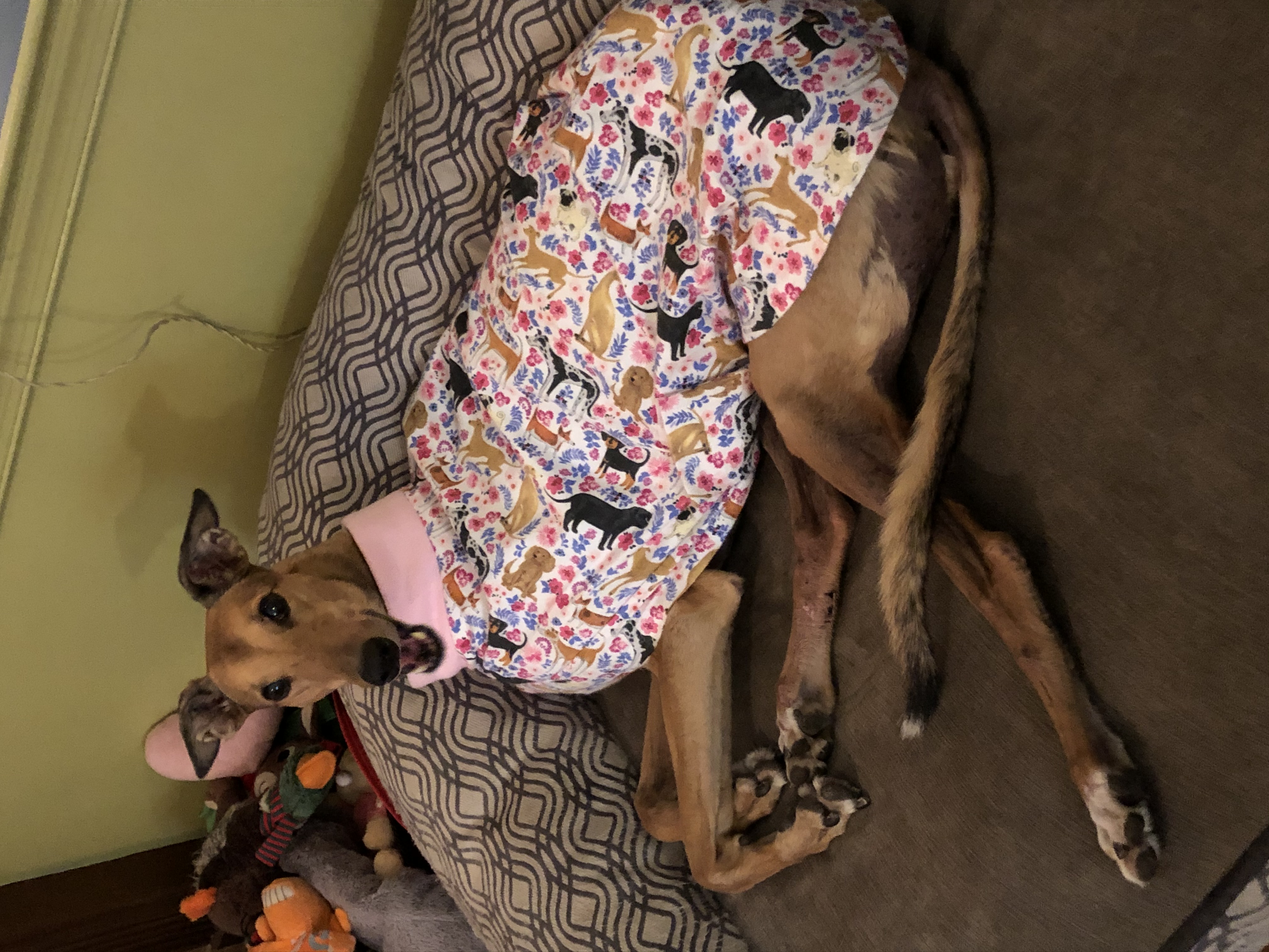 Fancy is wearing her floral dogs patterned housecoat. It matches the one her sister Paris is wearing.