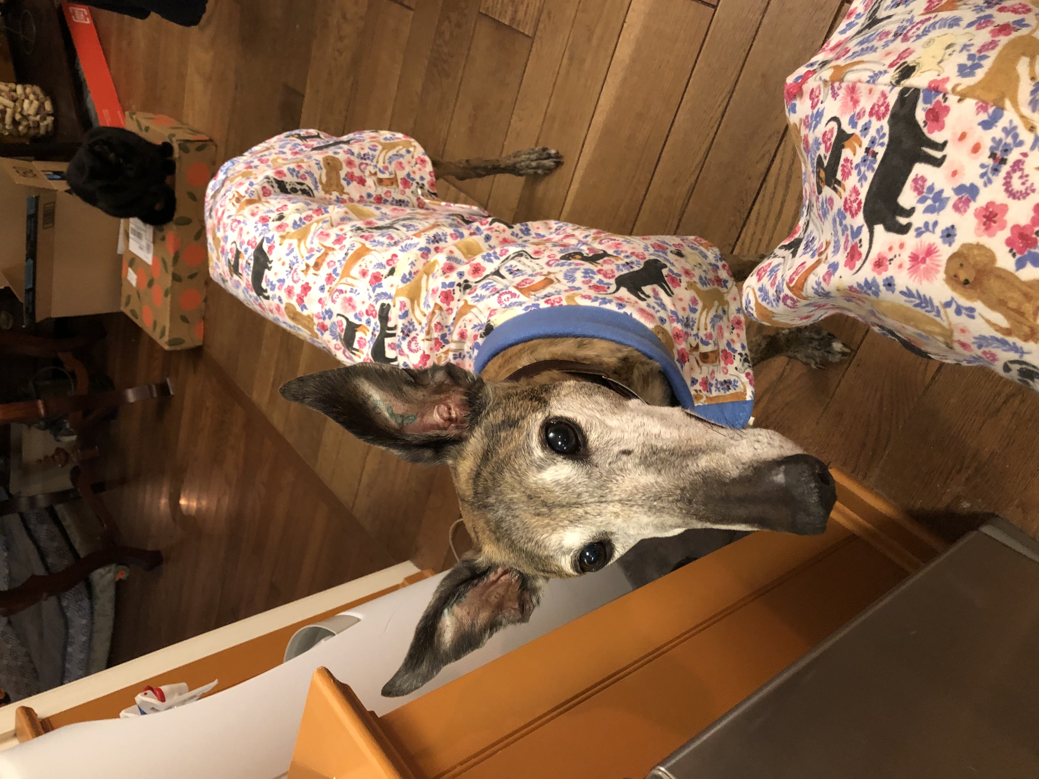 Paris is wearing her 100% cotton flannel house coat in floral dogs pattern.