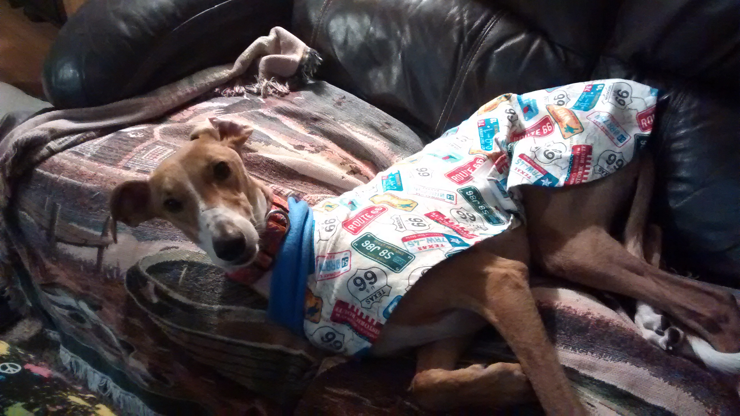 Cooper is a Galgo. He is wearing 100% cotton flannel house coat, license plate pattern.
