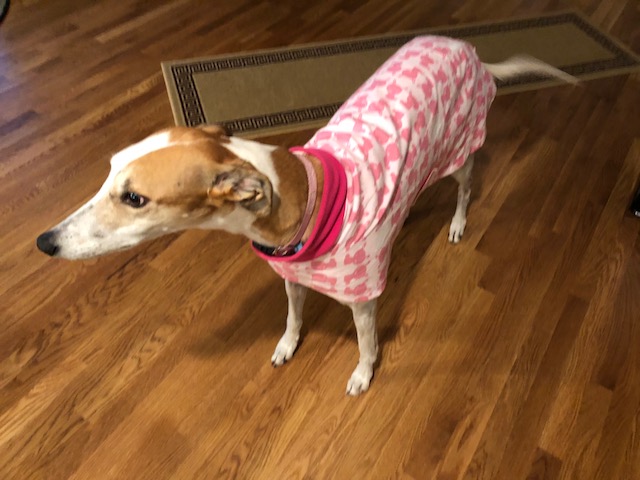 Lizzy in her pink bunnies flannel housecoat.