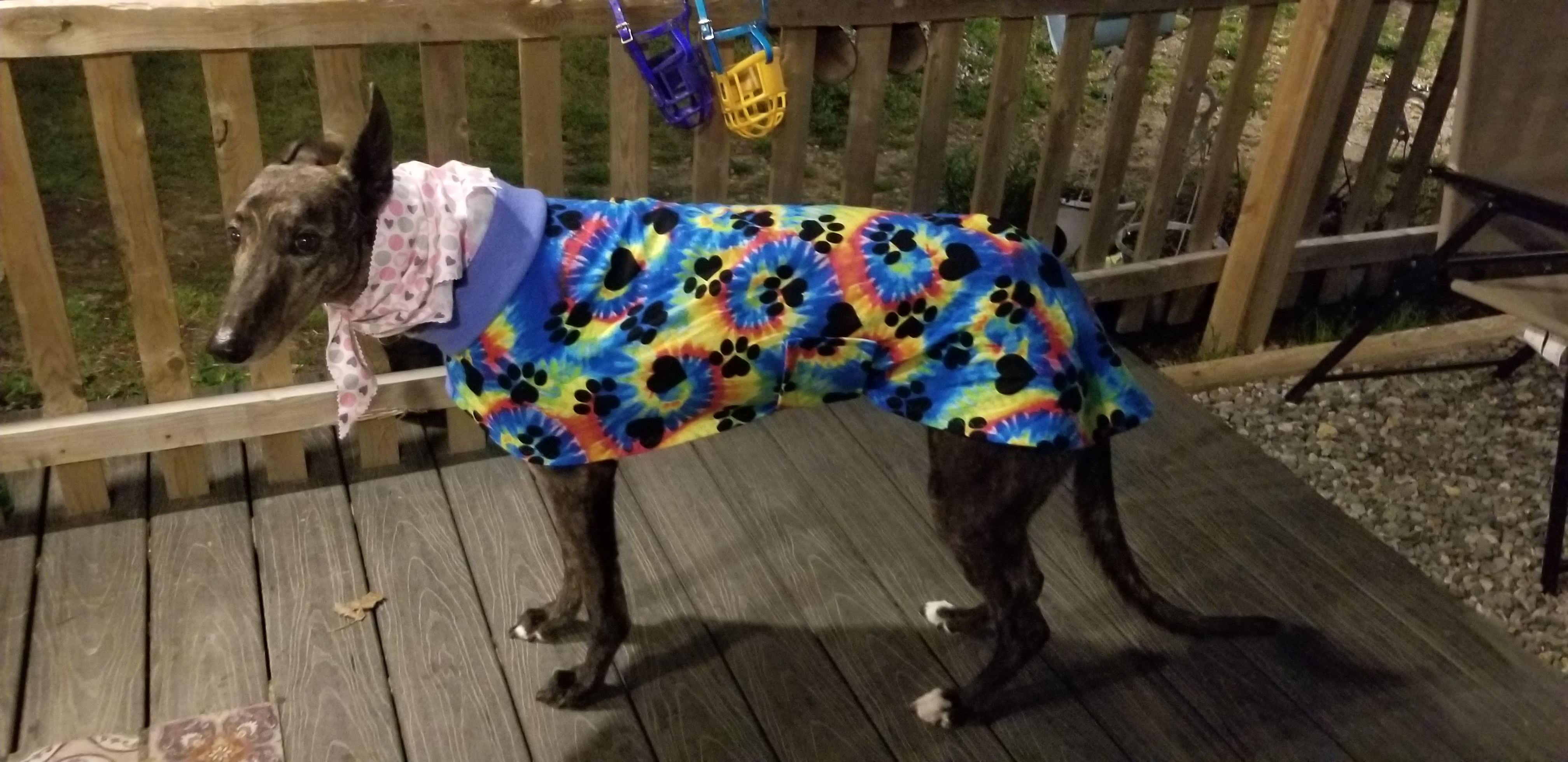 Mary is wearing her 100% cotton tie dye hearts and paws house coat.