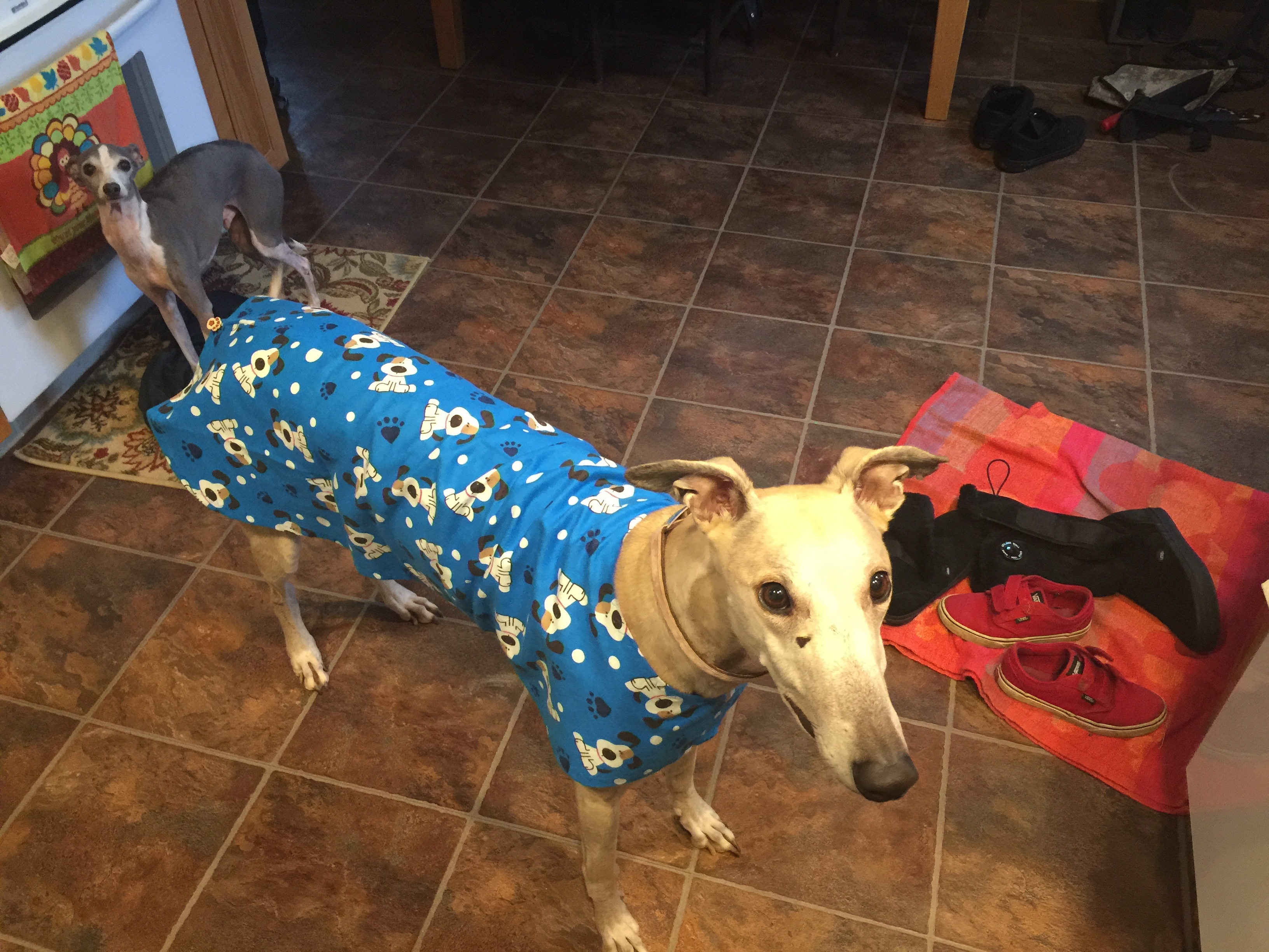 Memphis in her Happy Dogs housecoat. It was her Gotcha Day!!