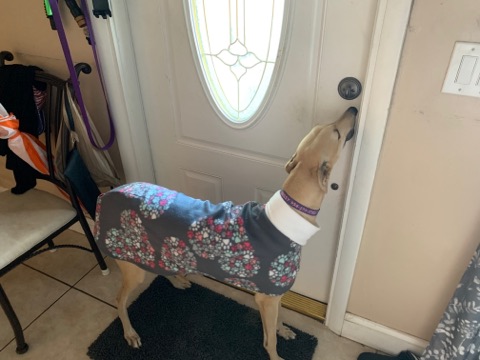 Missy in Grey Heart Cluster Paw Prints patterned fleece jacket.