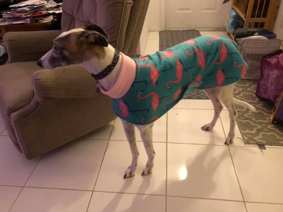 Paisley is wear pink flamingo fleece which is appropriate since she lives in Florida.