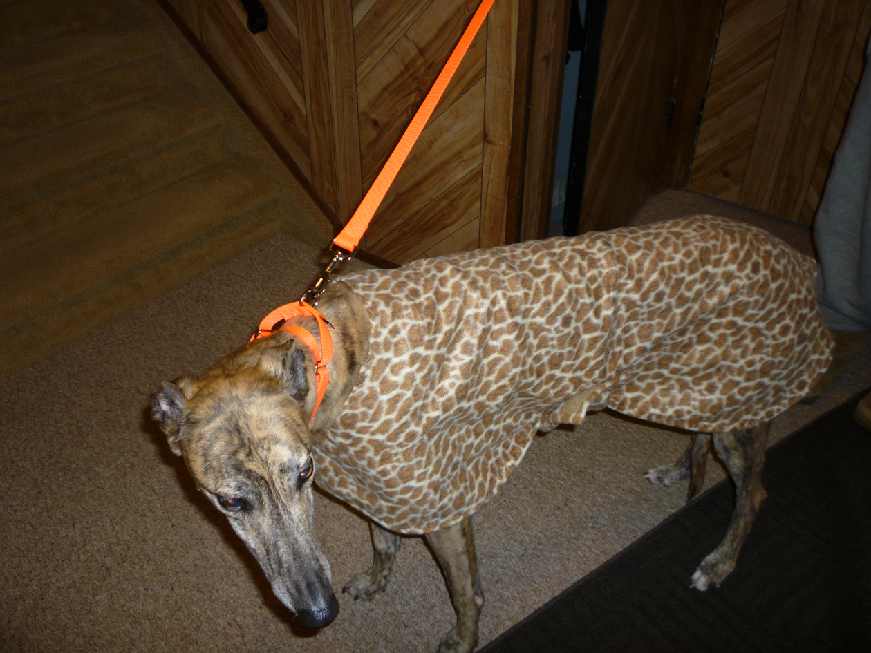 Scarlett, who was lost in the blizzard of 2010, in her new animal print coat.