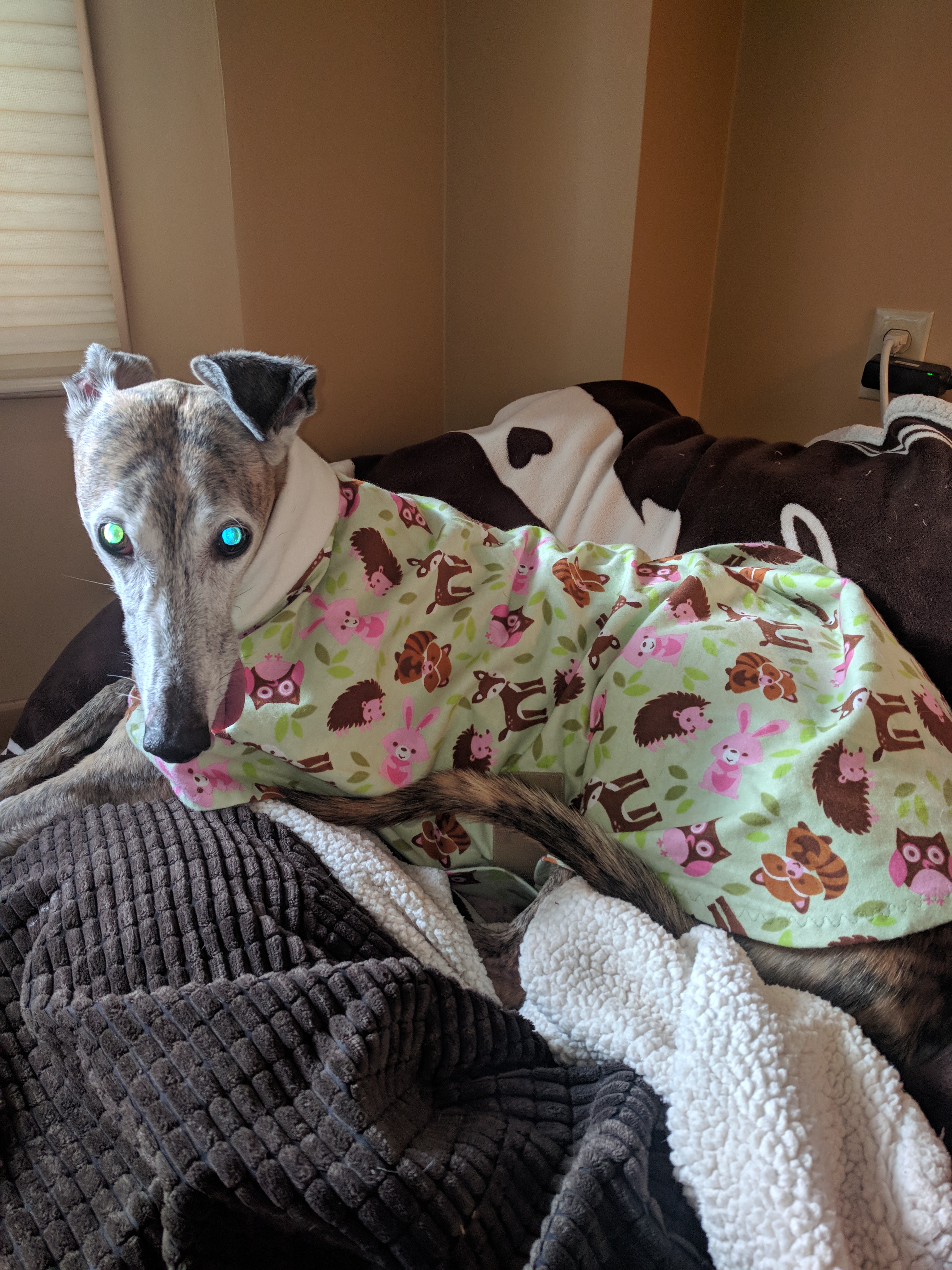 Cricket is modeling her 100% cotton, flannel, housecoat. Pattern is Pink Critters. She is in Canada.