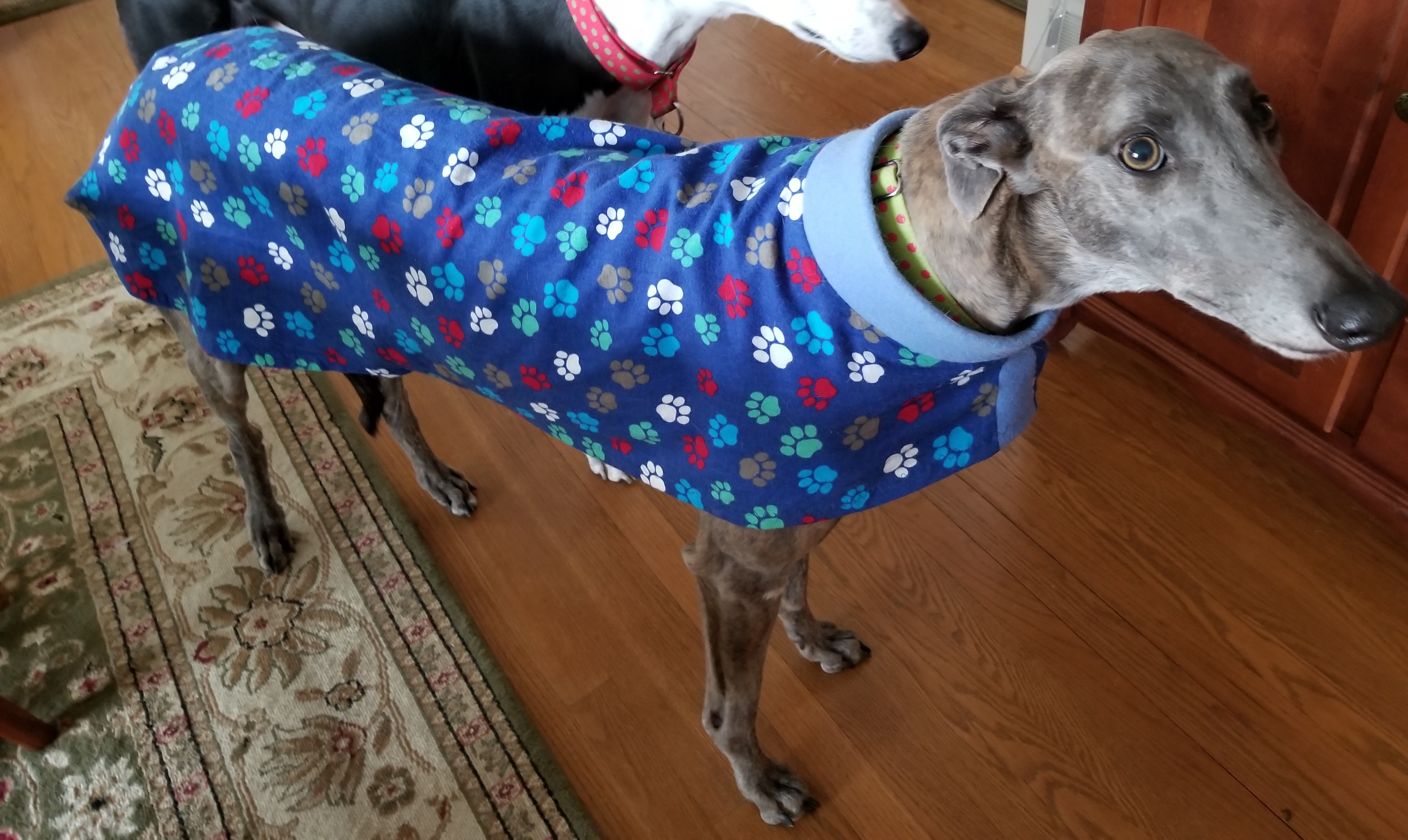 Carson is wearing his 100% cotton, flannel, paw print house coat.