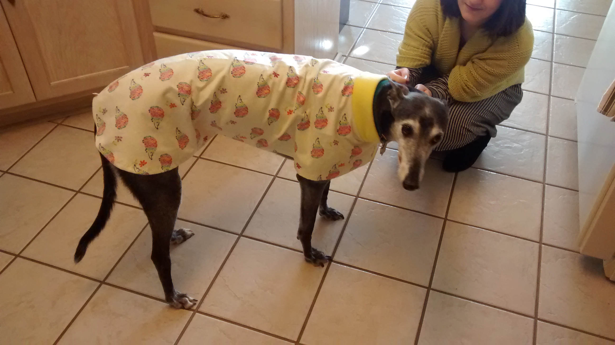 Lucy models her Rainbow Hedge Hogs flannel house coat.